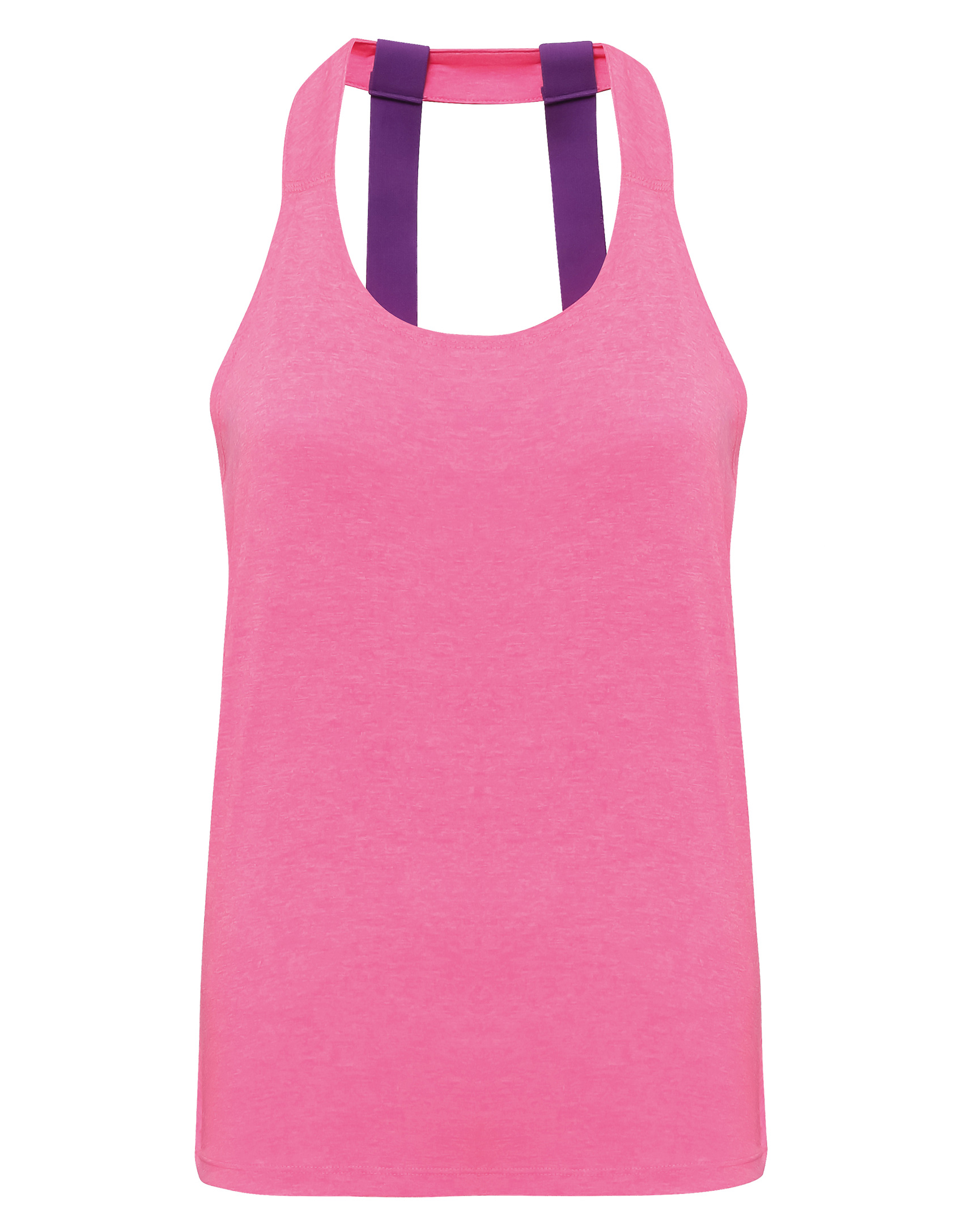 Soft touch fabric. Contrast double strap on back. Open back. Slight hi-lo hem. Twin needle stitch on hem, neck and arm holes. Slight stretch.