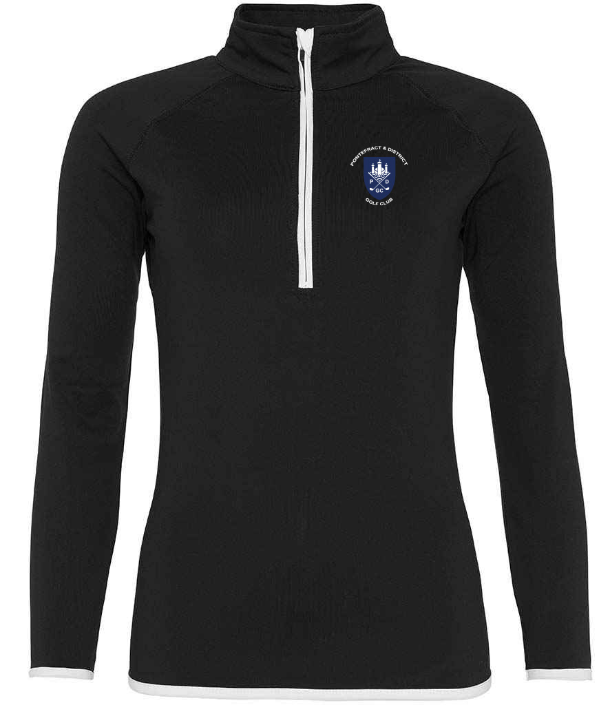 Ladies half zip performance top with printed PDGC logo to left chest