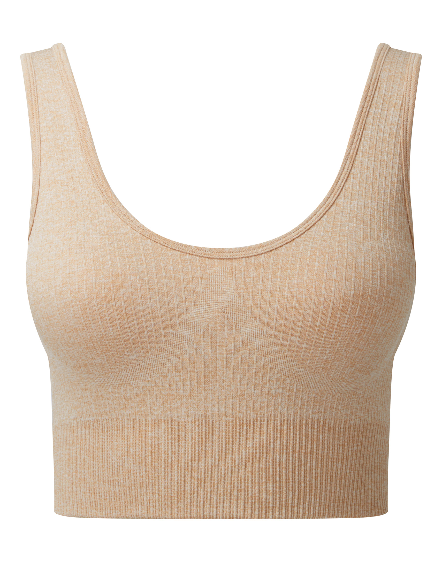 Seamless sports bra. Grown-on waistband. Body sculpting design detailing. Removable padding. Medium impact.