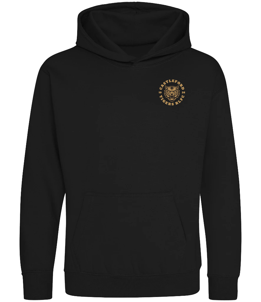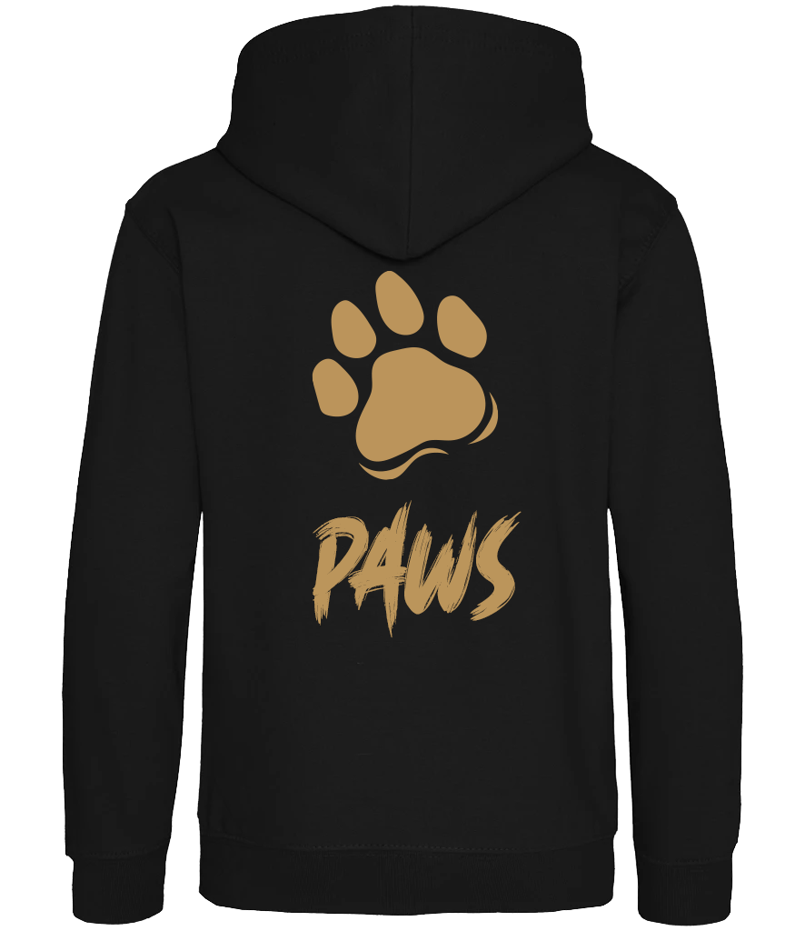 Black with small Castleford Tigers logo in gold printed to the left chest and a large PAWS print to the back of the hoodie.